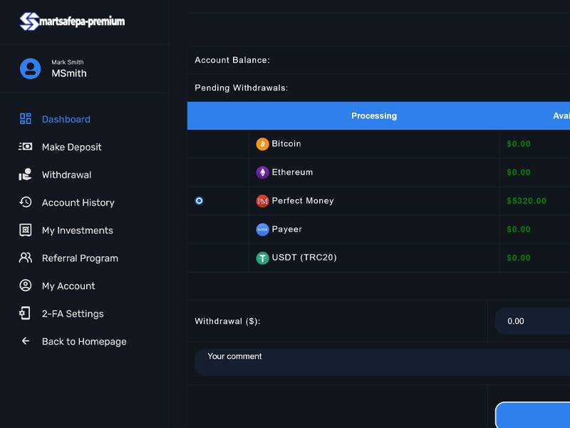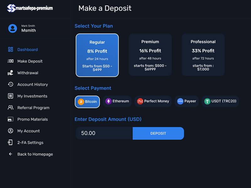 To invest in smartsafepal-premium.com you must have one of the supported cryptocurrency (Bitcoin, Ethereum, USDT (TRC20) and crypto wallet to manage it, or a registered account on PerfectMoney.com or payeer.com.